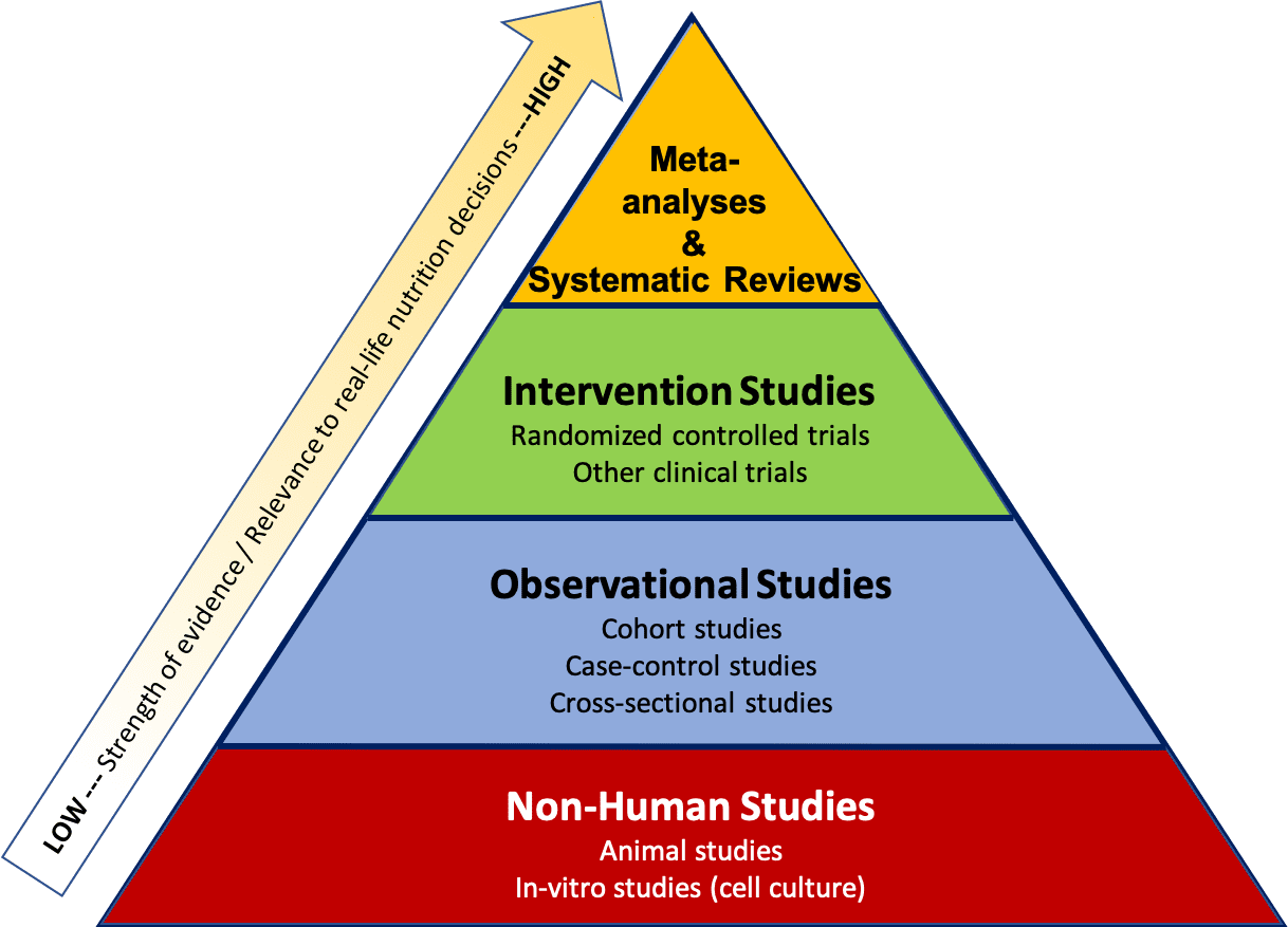 Systematic reviews and meta analyses sit at the top of this hierarchy because they provide data across multiple studies to provide more comprehensive conclusions. Randomised controlled trials and prospective cohort studies typically provide the most robust evidence when examining relationships between dietary exposures and health outcomes. However, the rapid growth of the field — and the diversity of methods used — can make it challenging for practitioners and consumers to interpret findings and translate them into practice.