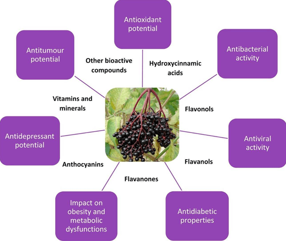 The rich and diverse phytochemical profile of the elderberry translates into a broad spectrum of potential bioactivities 1-5.  Figure 1 outlines the potential benefits of Elderberries and the way in which these are mediated through bioactive compounds have been proposed 9.