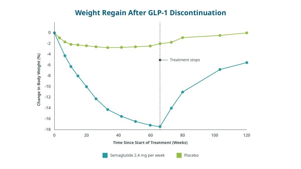 Whilst GLP-1 RA usage is effective at driving weight loss, the magnitude varies depending on factors such as the type of GLP-1 RA used, treatment duration, and the individual.  Weight regain following discontinuation of these medications is common (Figure 2), with up to two-thirds of weight loss being regained within the first year 24.  This is likely driven by the lack of education surrounding lifestyle and behavior change strategies adopted by GLP-1 RA users, which would encourage continued healthy lifestyle habits following medication cessation.