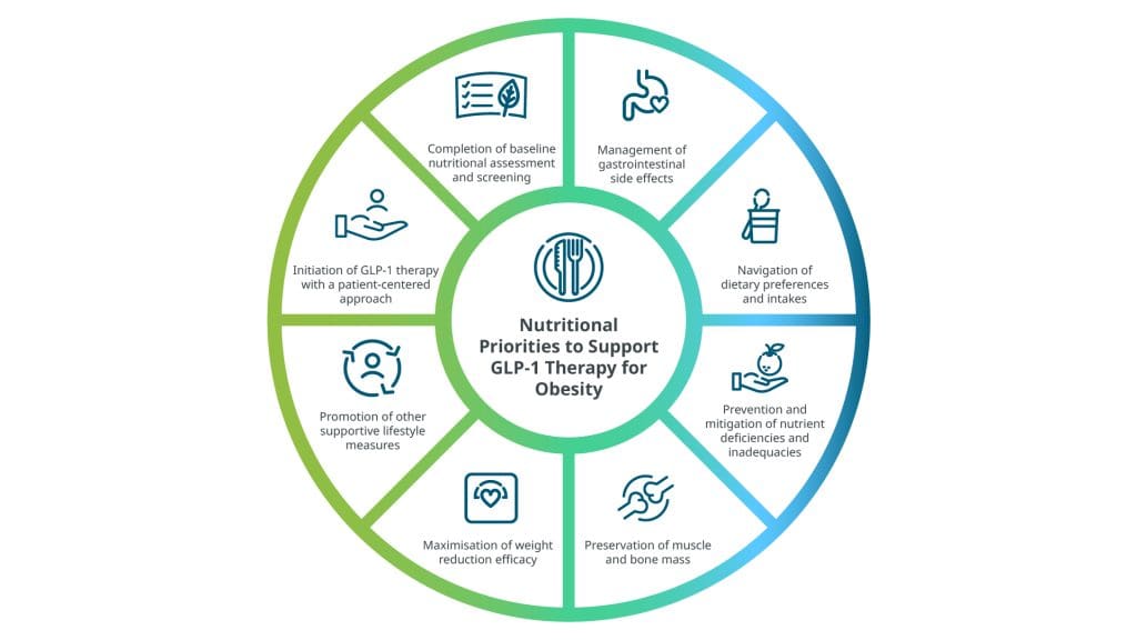 Figure 3. Key elements of nutritional priorities to support GLP-1 therapy users for obesity 27.  Reproduced from Mozaffarian et al. 27, © [2025], published by Wiley, under CC-BY license.